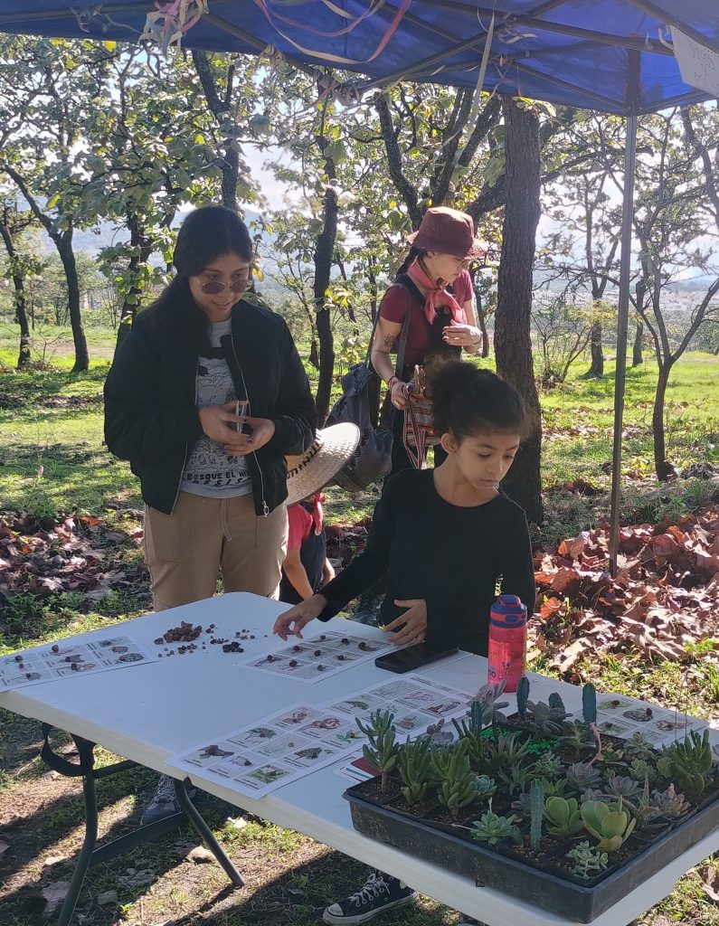 Algo que los compas del Comité mencionaron durante los talleres es que el bosque cuenta con una gran diversidad, ellos han tenido una labor en el registro de ésta, un ejemplo de esto son los juegos de mesa que crearon para dar a conocer algunas de las especies de plantas y animales que habitan el bosque. En el taller de juegos de mesa pudimos jugar a la lotería y conocer la representación en acuarelas de la lagartija de papada rosada, el nopal, el zopilote, el cardo santo y el carpintero mexicano. Este taller convocó a muchos niños, que entre risas y el canto de la lotería pudieron comprender la importancia de defender al bosque.